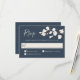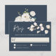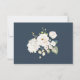 With modern charm and elegance, this wedding response card design features a neutral colour scheme with white florals in soft watercolor white and off-white with trailing greenery over a popular navy blue background. The front of the design has a sprig of small white blossoms and the back includes a beautiful bouquet of white roses and hydrangea with other mixed blossoms. This design is a lovely choice for spring and summer weddings. Personalise the text template with your required response date.