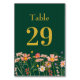 Boho Fall rustic Wildflower Meadow dark emerald green and gold wedding table number card featuring original watercolor floral artwork by Catherine Sweetman, perfect for a bohemian or rustic autumn wedding. This design showcases hand-painted wildflowers in a rich, earthy color palette of burnt orange, terracotta, rust, blush pink, peach, purple, coral, soft pink, and golden yellow ideal for fall, late summer, or spring celebrations. The whimsical florals and modern elegant gold typography on a rich dark emerald green background and add a romantic touch to your wedding reception, helping guests find their seats in style. Fully customizable to match your wedding décor, these table numbers make a beautiful and functional addition to your boho wedding tablescape. Great for outdoor weddings, garden receptions, or nature-inspired events.