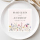 Elegant floral wedding napkins featuring a bottom border of watercolor wildflowers and foliage in shades of pink, yellow, purple, blue, and green on a blush pink background. Personalise the wildflower wedding napkins with your names and wedding date. The personalised wildflower napkins are perfect for couples showers, engagement parties, rehearsal dinners, and wedding receptions. Designed to coordinate with our Elegant Wildflower Meadow wedding collection.