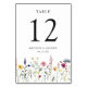 Elegant floral wedding table number cards featuring watercolor wildflowers and foliage in shades of pink, yellow, purple, blue, and green bordering the bottom of the design. The design repeats on the back. The rustic wildflower wedding table cards are perfect for spring and summer weddings. To order the table cards: add your name, wedding date, and table number. Add each number to your cart individually and check out when you're finished.