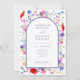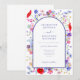 Elegant watercolor floral purple arch wedding invitation with colourful wildflowers and ideal for spring or summer wedding. A whimsical yet stylish design with modern typography script with easy to personalise templates in purple. Wildflower paintings include vibrant red poppies, cornflowers, cosmos flowers, forget me nots and billy buttons in purple, pink, peach, sage green, teal, orange and blue. Original botanical artwork by artist Catherine Sweetman