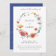 This design features a delicate watercolor wreath made of wildflowers in shades of blue, red, orange, violet, and gold. Perfect for spring and summer outdoor weddings.