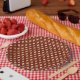 Elegant paper party plate features gold metallic retro carnival style harlequin diamonds pattern on a wine red background. Perfect for all sorts of special events and celebrations.