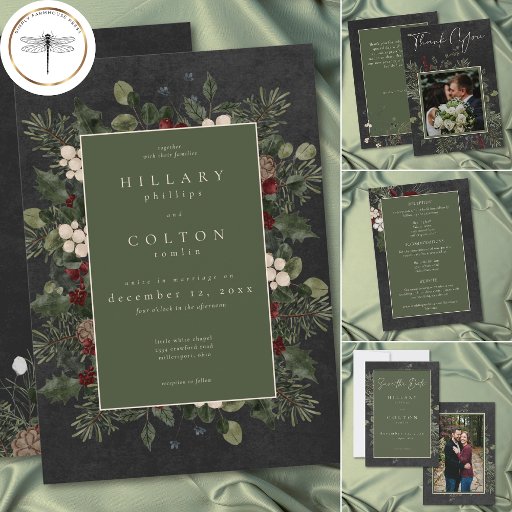 Introducing our enchanting winter wedding invitation, where timeless elegance meets the beauty of the season. The rich charcoal black background, softly distressed with white accents, sets a captivating tone for your special day. In the dark sage green text area, your wedding details stand out, surrounded by a delicate cream frame that adds a touch of refinement. Embrace the spirit of winter with a breathtaking frame of lush greenery, featuring holly adorned with rich red berries, mistletoe with its delicate white berries, and the timeless allure of green pine. Created by Simply Farmhouse Press.