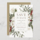 Winter Greenery and Florals Wedding Save the Date invitation featuring a frame of watercolor evergreens and snowflakes. Customise with your information. Click "click to customise further" to change the font style, size or colour.