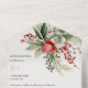 This All-in-One wedding invitation is designed to encapsulate the enchanting essence of winter with elegant bouquets of flowers, berries, and pine that beautifully marries the romance of your love story with the charm of the winter season. The All-in-One wedding invitations are both beautiful and practical by combining the wedding invitation with an easy to remove perforated RSVP postcard. They are also quick and easy to prepare for mailing. Simply address the invitation, fold the back flap and seal with the included clear stickers. Once your guests receive the pre-addressed invitation they simply tear off the perforated RSVP card and drop it in the mail. The addition of the QR code allows your guests to easily access your wedding website for information including reception details and dinner choices!