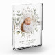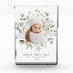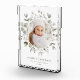Elegant holiday photo block featuring your photo encircled by watercolor snowberries, eucalyptus leaves, and lush sage green foliage. Personalise the front of the botanical Christmas photo block with a custom greeting, your family name, and the year in sage green lettering.
