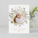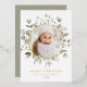 Elegant holiday card featuring your photo encircled by a gold foil frame with watercolor snowberries, eucalyptus leaves, and lush sage green foliage. Personalise the front of the botanical Christmas photo card with a custom greeting, your family name, and the year in sage green lettering. The card reverses to display your custom message in white lettering with a dark sage background.
