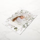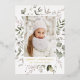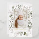 Elegant holiday card featuring your vertical photo framed in white with a background of watercolor snowberries, holly, eucalyptus leaves, and lush sage green foliage. Personalise the front of the botanical Christmas photo card with a custom greeting and your family name in gold foil lettering. The card reverses to display your custom message in white lettering with a dark sage background.