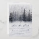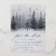 Winter save the date card featuring watercolor pine trees in shades of grey and navy blue. "Save the Date" is displayed in a modern silver foil script with your name and wedding details shown below. These pine tree save the dates are perfect for winter weddings!