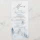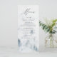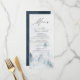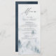 Elegant custom wedding menu card featuring your menu details at the top of the menu with a forest of grey & misty blue watercolor pine trees at the bottom. The menu reverses to a navy blue watercolor background with space for text and photos. Designed to coordinate with our Elegant Winter Forest wedding collection.