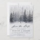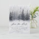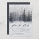 Winter save the date card featuring watercolor pine trees in shades of grey and navy blue. "Save the Date" is displayed in a modern calligraphy script with your name and wedding details shown below. These pine tree save the dates are perfect for winter weddings!