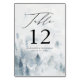 Elegant, winter wedding table number cards featuring misty grey and dark blue watercolor pine trees and mountains. Personalise the pine tree table number cards by adding the table number, your names, and wedding date. Designed to coordinate with our Elegant Winter Forest wedding collection.