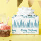 An elegant row of winter fir trees and snowflakes above your personalised Merry Christmas script and your family last name in pretty blue below the snow filled forest. A modern holiday design with your custom message on lovely wrapping paper.