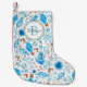 Decorative watercolor blue winter patterned Christmas stocking with elegant monogrammed wreath.