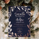Elegant winter wonderland navy blue wedding photo with modern wreath and real rose gold foil leaves, all the colours are fully editable to match your colour palette. Add or remove your photo. Perfect for a simple and elegant winter or christmas greenery wedding.