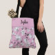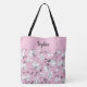 Elegant tote bag featuring a delicate black and white orchids pattern on a cameo pink background. The band on the upper part of the bag is customisable by adding your name (or other text) in a black calligraphy font.