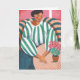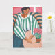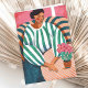 Stylish illustrated greeting card featuring a relaxed woman seated in a cosy chair beside a small pink flower plant. The modern painterly artwork with bold stripes and warm colours creates a calm, artistic atmosphere—perfect for sending thoughtful notes, encouragement, or everyday greetings. Original artwork by Caroline Bonne Müller