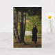 This photographic card depicts an elegant woman peering up at a birch tree. Perfect for a variety of occasions.