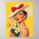 A glamourous woman in a white hat with a red bow, holding a bouquet of yellow and white daffodils against a vibrant yellow background.