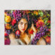 A woman poses with a crown of grapes, pomegranate fruits and flowers, surrounded by lush produce and blossoms. The portrait blends elegance and natural beauty in vivid composition.
