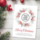 Corporate holiday greeting card for your business or organisation featuring your corporate logo, a watercolor wreath of red florals, berries and seasonal greenery, and "Merry Christmas" in an elegant red script. Personalise your greeting and company name in simple modern typography.