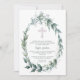 This modern first communion invitation features a pink cross and an elegant watercolor wreath of leaves and silver-grey flower buds. MATCHING items in our collection.