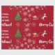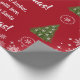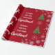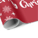 Modern, elegant, and cute Christmas giftwrap with the words "Merry Christmas" in stylish typography, a personalised dedication now reading "To Amber / with love / from Santa," snowflakes, an illustration of a unicorn (with a red and golden mane and tail) pulling Santa in his sleigh, and a Xmas tree. On a red background with snowflakes.