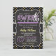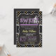 Cute Sweet 16, sixteen, invitation on yellow, black, and grey stars, starry night pattern with purple ric rac design elements. 16th, Sixteenth birthday party invite for girls. Vintage feel girly purple and yellow chalk fonts on cool blackboard background.