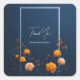 Make a truly sophisticated and modern statement with this elegant floral thank you sticker. The design features a deep, solid navy blue background, creating a dramatic, high-contrast canvas. A clean, minimalist rectangular frame in a bright, metallic silver provides a sharp, contemporary border for your message. At the base, a beautiful, illustrative arrangement of flowers blooms in shades of vibrant golden-yellow, warm orange, and pale peach. These stunning roses are contrasted by deep, muted teal-blue leaves and small clusters of orange berries, creating a sophisticated and artistic composition. These stickers are perfect for businesses with a modern, high-contrast aesthetic, such as boutique stationers for sealing envelopes, interior designers to add a pop of colour to client materials, event planners for a modern wedding, or high-end gift shops. This versatile design can also be used to beautifully seal envelopes for autumn weddings or formal events, or as a sophisticated accent on party favours and gift wrapping.