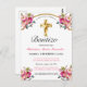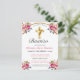 Celebre el bautismo de su hija con amigos y familiares con esta elegante postal de invitación de recepción de bautismo floral dorada y rosa. Este diseño presenta una hermosa cruz de oro con ramos florales rosados decorados contra un fondo blanco simple.