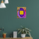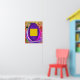 Two symbols for the element of Ether and Earth plus bright colourful patterns. Yellow square and purple egg.