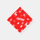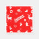A set of paper napkins with white seamless repetition of Christmas elements - stockings, gingerbreadman, snowflakes, reindeer, Christmas ornaments, candles, Christmas tree, and the words "Merry Xmas" - in illustration, against a red background.
