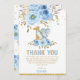 Whimsical Blue Floral Elephant 1st Birthday Thank You Card, featuring a cute baby elephant, a gold glitter number one and beautiful blue watercolor flowers. Personalise this gorgeous invitation with thank you message easily and quickly, simply press the customise it button to further re-arrange and format the style and placement of the text. A pretty matching floral backside of invitation included.