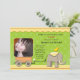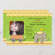 An adorable unisex design featuring an elephant pulling a cart with your child's photo in it. The green, polka dot background has a yellow/orange, scalloped awning.
