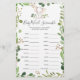 Elephant themed baby shower word scramble game card features a watercolor elephant illustration and watercolor greenery eucalyptus garland and elegant handwritten style font.