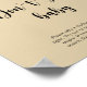 My thoughts on this product was excellent. Well printed in a gloss finishing and just the size l ordered. It arrived in good condition and am overall satisfied with the product. The printing turned out great. I was quite surprised with the finishing touch to the poster. The semi gloss was just right and a perfect size to display at the wedding.