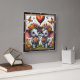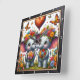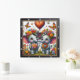 This delightful square wall clock features a whimsical digital illustration of two baby elephants standing together in a vibrant wildflower meadow. Each elephant is adorned with a large, colorful crown made of daisies and roses, and they both hold matching floral bouquets in their trunks. A large, patterned heart-shaped balloon floats between them, while bright butterflies dance through the airy, white background. The scene is filled with smaller floating hearts and a lush ground cover of diverse blossoms. The artwork is housed within a modern black wood-grain frame with bold white numerals for clear visibility. This functional home accessory is an ideal decorative piece for nurseries, playrooms, or as a sweet Valentine Day gift. Its cheerful composition and high-contrast detail provide a joyful and romantic focal point for any interior wall.