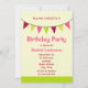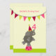 A girl's birthday party invite featuring an illustration of an elephant on the front. Elephant is wearing a dark red hat with stars and standing on a pink platform balancing the number of the child's age on its trunk. Multicolored flags at top. Personalise the text on front and back.