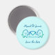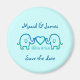 2 cute green-blue elephants holding a heart for your "save the date" announcement. The text and colour of the background are customisable.