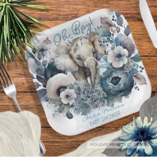 Beautiful blue floral bouquet with hydrangeas and anemones along with blue tinged greenery are the perfect surrounding for this majestic baby elephant in this blue watercolor "Oh Boy" Baby Shower design.