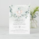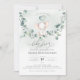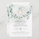 A little cute elephant on a eucalyptus branch swing. This baby shower invitation features hand-drawn watercolors and modern fonts.