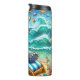 This whimsical illustration depicts a happy elephant on a tropical beach vacation. He is relaxing on a striped lounge chair, wearing a straw hat and sunglasses, and enjoying a colourful drink. The vibrant scene includes a beach umbrella, crashing ocean waves, and scattered seashells, creating a cheerful and fun summer-themed artwork.