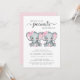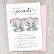 A cute twin girls baby sprinkle invitation with "Two Sweet Little Peanuts Are On Their Way" written in soft grey modern typography and a stylish swash script and two pink watercolors of baby elephants. Personalise the mother-to-be's name and shower details in simple grey typography.