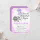 Soon the adventure begins baby shower invitation with adorable decorated elephant with a trunk full of balloons to announce the baby on the way. Gender neutral design in purple, pink and blue for a colourful and fun baby shower.