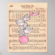 Three elephants balancing on a pink ball. The elephant at the top is holding a pink flag. Whimsical vintage sheet music Jesus Loves Me hymn background. Perfect for a boy or girl nursery or kid's bedroom!