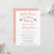 A cute typographical invitation for the dedication of your little girl featuring a line from the popular hymn Jesus Loves Me. The phrase "Little ones to Him belong" is written in coral peach brush script font, flanked by two grey elephants. This invitation provides space for both ceremony and reception details.