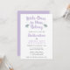 A cute typographical invitation for the dedication of your little girl featuring a line from the popular hymn Jesus Loves Me. The phrase "Little ones to Him belong" is written in lilac brush script font, flanked by two grey elephants. This invitation provides space for both ceremony and reception details.