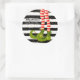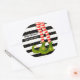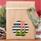 Elf legs in striped tights and green boots on black and white stripes and gold dots includes your personal greeting on these Christmas round stickers. MATCHING items in our store.