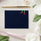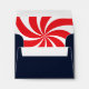 This dark blue envelope has a simple, funny design with elf legs wearing green & white striped tights and red elf shoes, with tiny jingle bells on the front and a bright, fun, festive,red and white peppermint candy swirl on the inside.